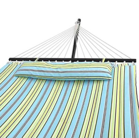 Brand New, in box. Songmics brand Heavy Duty 2-Person Reversible Hammock with attached Wooden Spreader Bar and Pillow. (UGDC34Q) Measurements: 133.8"L x 55.1"W. Maximum capacity weight: 495 pounds....