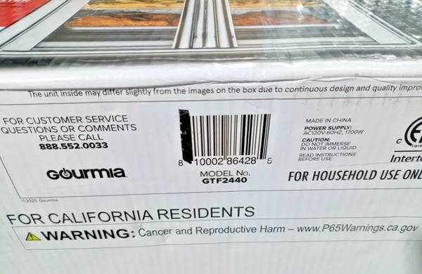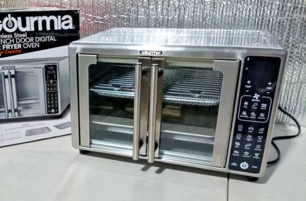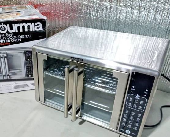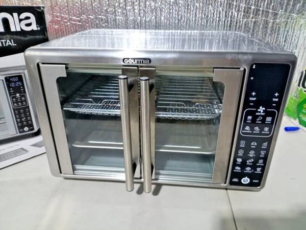 The Gourmia French Door 6-Slice Digital Toaster Oven Air Fryer is a versatile kitchen appliance with 19 one-touch presets for various cooking modes such as toast, broil, and bake. With a maximum timer setting of 60 minutes and a power of 1700W, this electric toaster oven offers convenience and efficiency for all your culinary needs. Featuring stainless steel construction and a sleek silver finish, this Gourmia model also includes features like auto shut-off, a crumb tray, and programmable cooking modes. Perfect for households looking for a reliable and high-quality toaster oven for their kitchen. Booklet is missing.