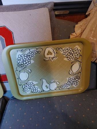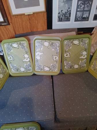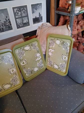 Have available these mid century modern metal trays set of 8 in mint condition. Need more info email or call. See sample pics below.