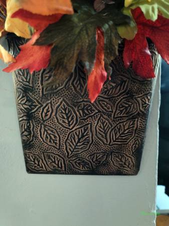 Bring the beauty of autumn into your home with this charming Hosley wall planter basket. Featuring a beautifully embossed metal leaf-pattern basket and an arrangement of lifelike artificial flowers in warm fall tones, this piece instantly adds seasonal flair to any room.