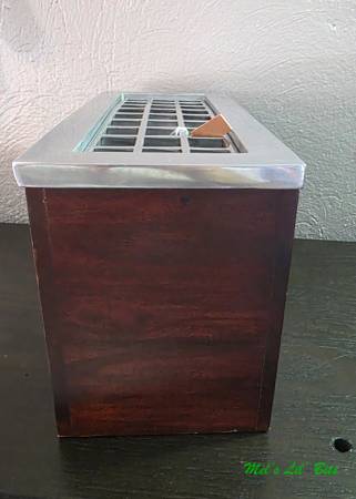 Outer shell looks to be Mahogany. The inner box seems to be aluminum along with the grate. There is no label or makers mark anywhere on these.