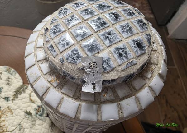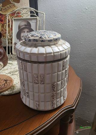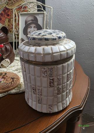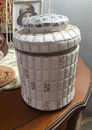 This Mosaic wrapped cigar tin measures approx 7" high x 4 3/4" in diameter.