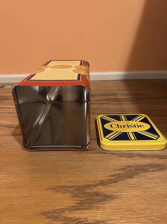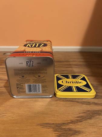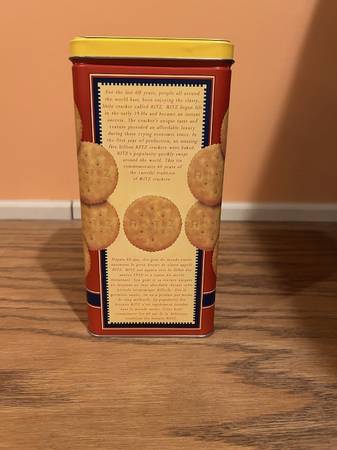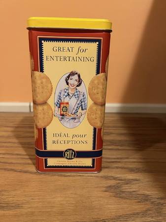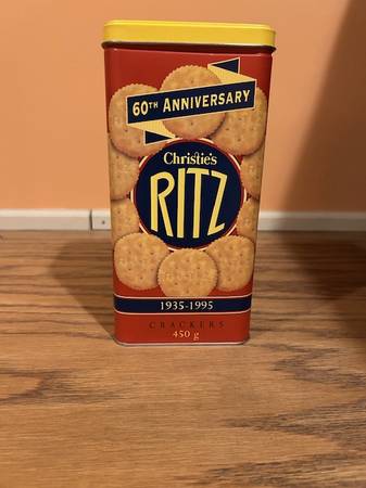 Christie's Vintage 60th Anniversary Ritz Crackers Metal Tin 1935 - 1995. 450 g container. Approximate dimensions are 4 1/2" x 4 1/2" x 8 3/4".