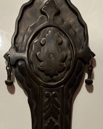 This is a vintage wall candle holder with ornate floral designs and a chain detail.