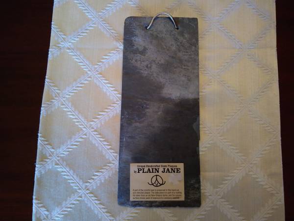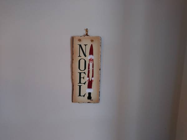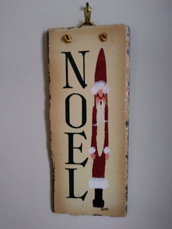 Vintage Hand Cut and Stenciled Santa/ Noel Slate Wall Plaque by Plain Jane, 11" X 4.5", traditional Holiday decor item suitable for indoor or outdoor. Perfect for front entrance, door, porch, foyer or anywhere in house. As noted on back, this slate piece is part of a roofing tile taken from an old New Orleans home and the uneven surface shows years of exposure to the Louisiana weather.