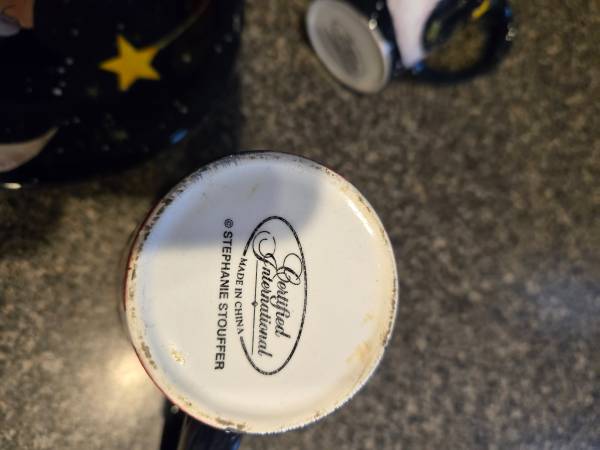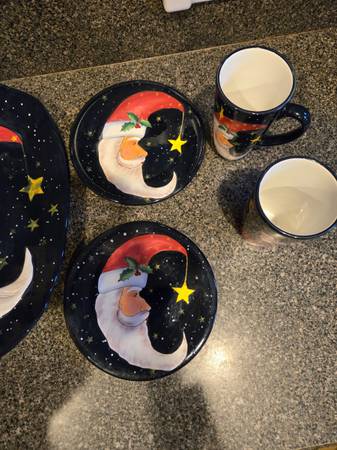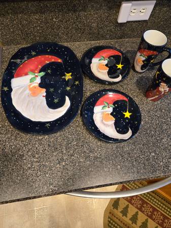 5-piece Santa set by Stephanie Stouffer; platter measures 16 1/2" x 12" oval, the plates measure 8 1/2" round, the mugs are 6" tall. All have variations of the Santa design, beautifully colored. In...