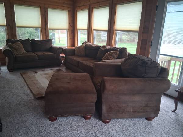 We have a Klaussner living room set for sale. It comes with a couch, loveseat, chair, ottoman and three pillows