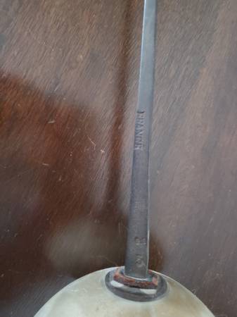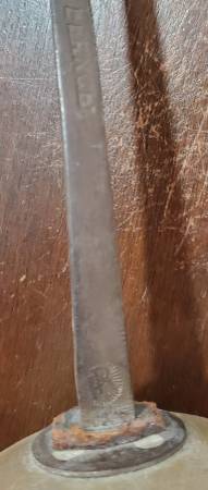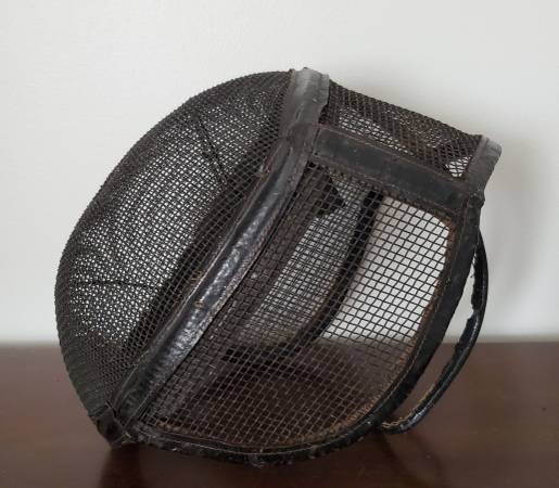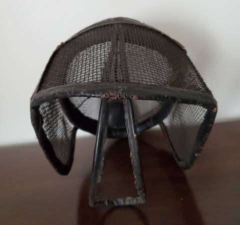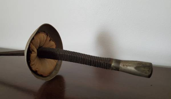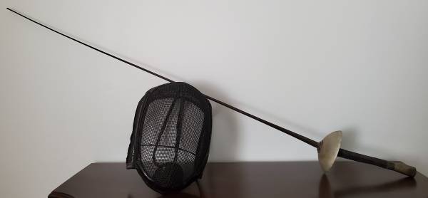 Old fencing equipment. Sword still has padding in the handle. Slight dent in the hand guard. Blade says "Made in France, G.S., and 5" on one side. On the other side, there is a maker's mark stamped in near the hilt that says PR. According to research, "PR" mark on antique French fencing foils points to the esteemed French manufacturer, Maison Prieur. Founded in 1788, the company has a long history of producing high-quality fencing equipment. This is likely from around the 1920's. There are no markings on the mask.