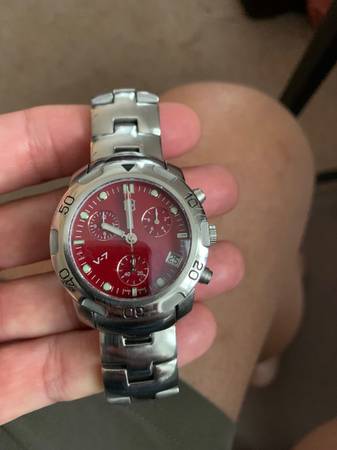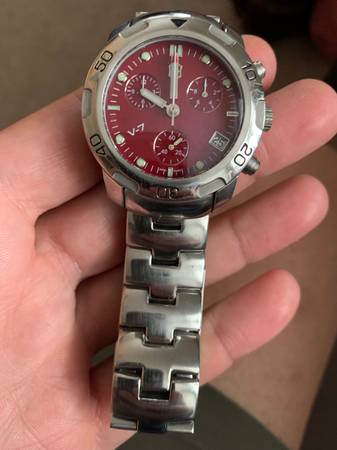 Victorinox V7-22X chronograph features stainless steel case and bracelet, red dial, Swiss quartz chronograph movement, sapphire crystal. Watch is in very good to excellent condition. $65 cash