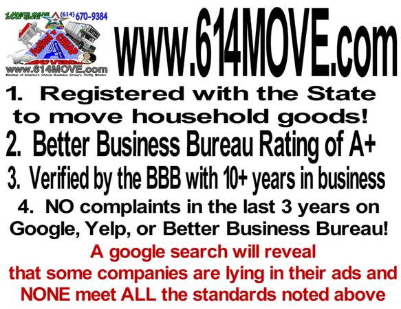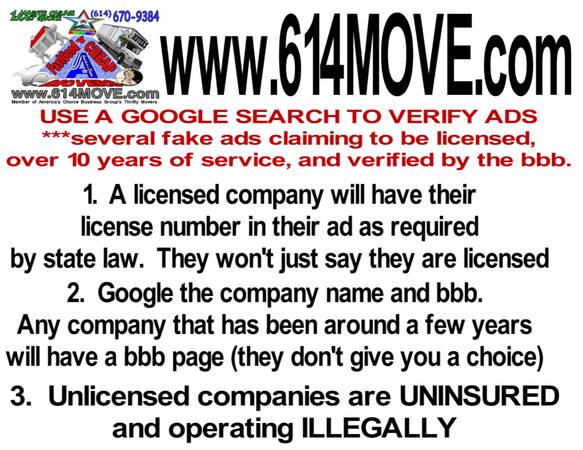 ***WE ARE THE ONLY A+ BBB rated MOVING COMPANY ON CRAIGSLIST and the ONLY company REGISTERED WITH THE STATE of Ohio. Any company claiming to be licensed will have their license number in the ad, it's State Law to post the number, they won't just say they are licensed (several ads falsely stating they are licensed). A CPCN number is required. A DOT/MC number, have NOTHING to do with being licensed in Ohio, nor does a certificate from the State for a business.... to move household goods AND be insured for residential moving, you must have a CPCN.