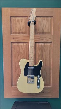 Fender American Vintage Reissue ’52 Telecaster in classic Butterscotch Blonde with black pickguard and ash body. Maple neck and fretboard with vintage-style frets, and period-correct hardware including brass saddles.