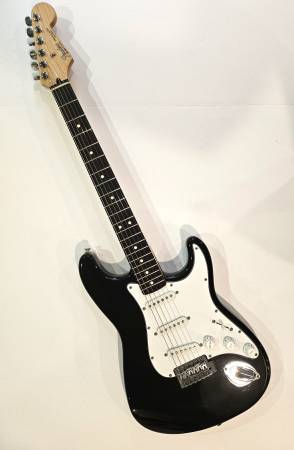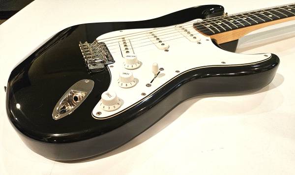 The Fender Stratocaster electric guitar, made in Mexico in 1990, features a solid black body with a maple neck and rosewood fretboard. This vintage model includes upgraded electronics, a hardshell case, two extra straps, two extra cables, picks, a polishing cloth, a guitar pin, and a Fender product book. With 21 frets, this right-handed guitar also comes with two sets of strings and an authentic Fender hardshell case, making it a comprehensive and high-quality option for guitar enthusiasts.