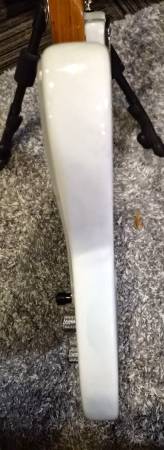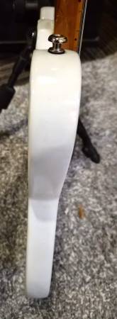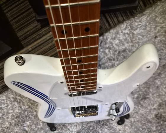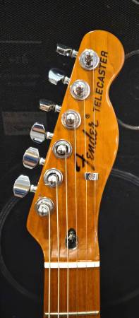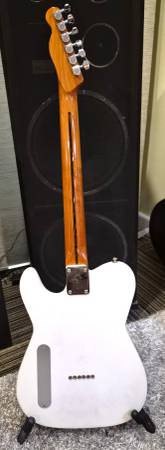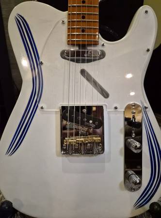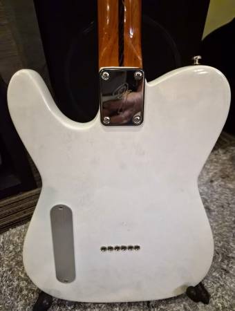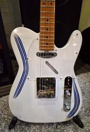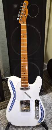 The body is a refurbished body and received lots of sanding and many coats of lacquer. As you may have noticed the body is a bit thinner than a conventional telecaster that makes it just a little bit lighter also. Everything else on this guitar is brand new including Roasted Maple Neck, Wilkinson Vintage Bridge, Wilkinson bridge and neck pickups, and upgraded electronics, and tuners, custom airbrushing of pinstriping, and clear pickguard.