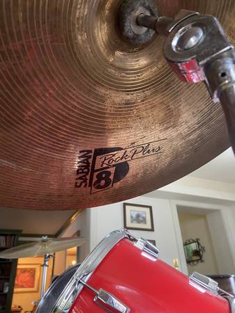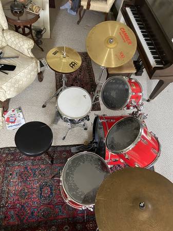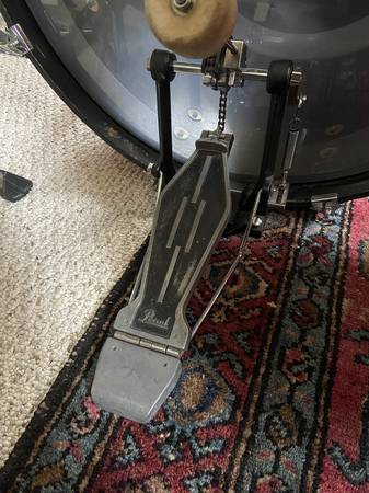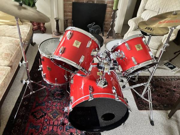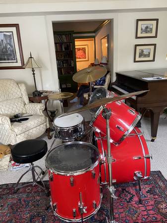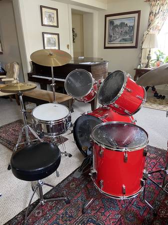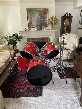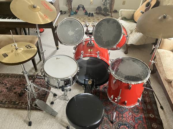 Complete kit in very good original condition. Only damage is some wear where the bass pedal attaches (see image). Everything works as it should and they sound wonderful. Newer Remo and Attack skins