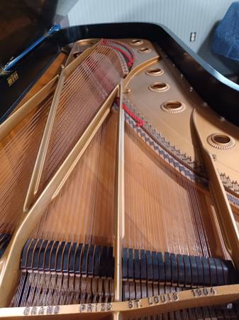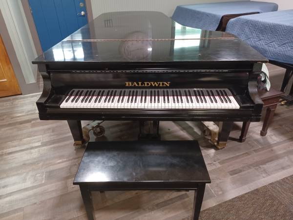 Here is a circa 1963 Concert Grand Baldwin. It has had a new Renner action put in just a few years ago, new front key bushings 2 months ago. Cabinet is original and in fair to good condition, Soundboard has one hair line crack that is nearly invisible, bridges are good. Piano holds pitch very well. Tone is powerful and bright yet very expressive. Action is very easy. It comes with a spider dolly and bench. If your looking for a concert grand you can't beat this price. Must Sell