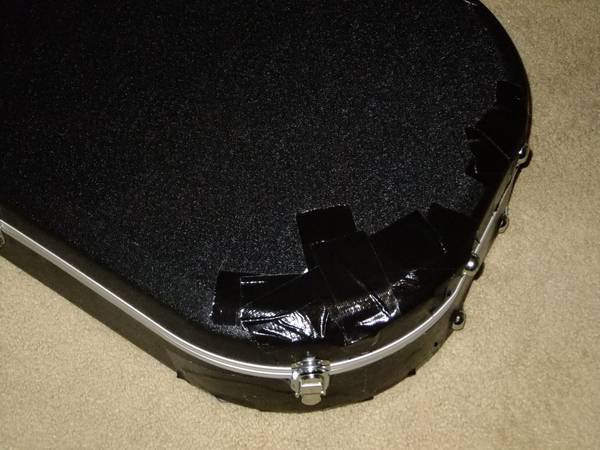 ABS Molded Hard Shell Acoustic Guitar Case – Damaged, but solid & functional. Not sure what brand. The hard shell ABS shell has been cracked/broken in places, mostly around the lower bout. The inner hard foam structure is undamaged. The inner plush lining and storage pocket is undamaged. The handle, hinges, and clasps are undamaged. I put black duct tape on the damaged areas of the shell, and it’s not as apparent in normal use as it shows in the pics. The guitar case is 100% functional. These guitar cases retail new for about $150.