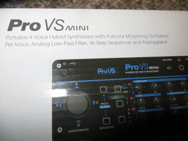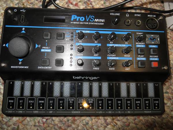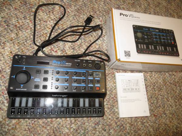 As new Behringer Pro VS Mini Hybrid vector Synthesizer. 4 voice/4 vector morphing oscillators per voice, 16 step sequencer and arpeggiator. Full size midi, joystick, usb power and computer connection, sync in, chorus, tons of presets, data screen, brushed aluminum body. Youtube for full demo and review
