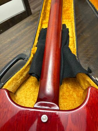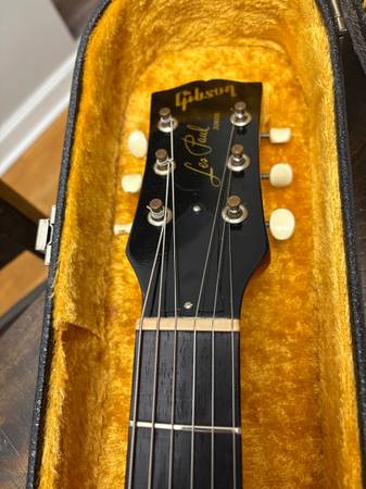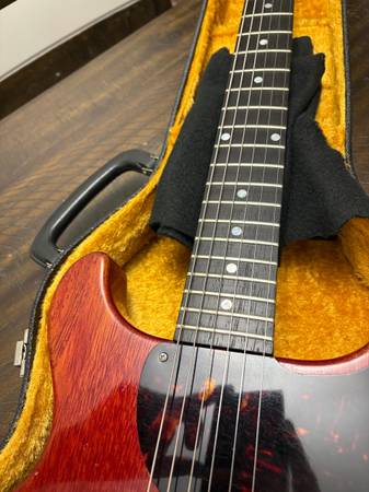 This is an awesome Junior, but I fell into a 4-digit ‘58 Junior shortly after acquiring this. I don’t need both. Here’s a chance to own a ‘59 for a fraction of the price. P-90, pots, tuners, pickguard, and studs are original. Bridge is a repro. Brazilian rosewood board. Now for the part that makes it affordable. This was owned by a popular guitarist that plays Juniors a lot and was toured. The headstock suffered a couple breaks and a new headstock had to be grafted back on. The same Serial was used and a Stinger was added. You can see the scarf joints. It was extremely well done. Wouldn’t be able to tell if there weren’t scarf joints. The guitar comes with the original Headstock that broke off for verification. Of course the neck was refinished. Body is original finish. Local pickup.