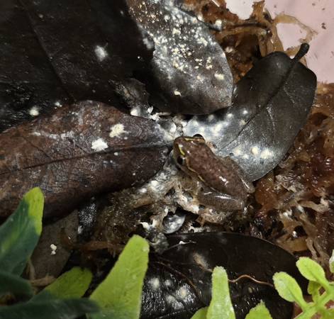 I have several Blue Back Reed Froglets, Captive Born and Raised. OOW 7/24. Measure around 5/8 of an inch, eating Hydei Fruit Flies. I have not tried pin heads with them yet. ForTyFiVe each. Text...