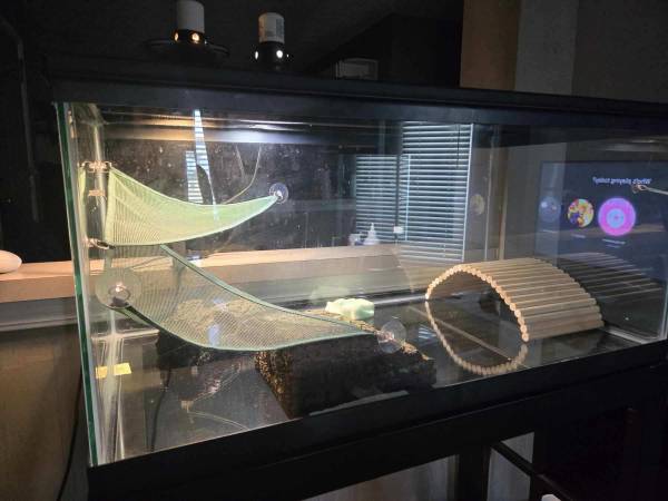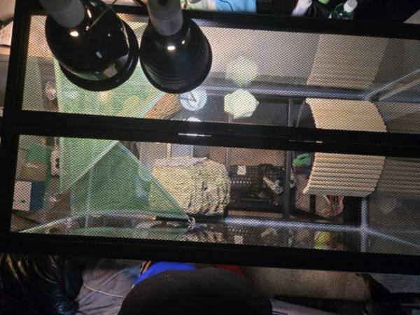 Will come with everything you need. Less than 2 yrs old -40 gal breeder tank w/screen top & stand (good quality & sturdy) -Basking & UV (round) lights with working bulbs -2 net hammocks...