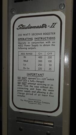 I have two Photogenic Studiomaster II Professional Studio Flash Units. These were serviced by Photogenic technicians and are in good working condition. The button control panels were upgraded to solid state and I used them in my Photography Studio for many years. The flash tubes and modeling lamps work and I have a spare modeling lamp and flash tube. Message me with any questions. If this post is online the units are available.