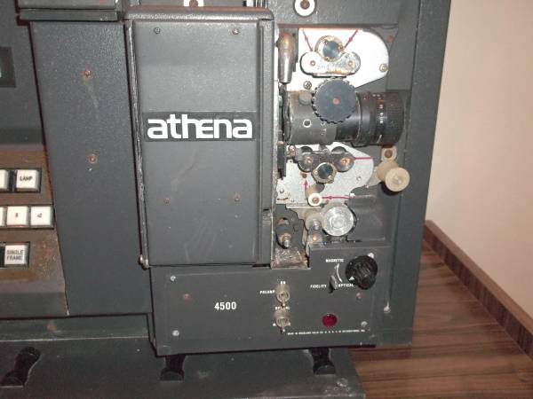 Athena model 4500 slo-motion film projector. Unit needs repairs to function as original or can be a parts donor. Motor Drive Amplifier (MDA) circuit not functional. Will power up without overloading due to short circuits and can be troubleshot to the component level. As new, this model sold in the mid $4K range. Side cover not shown but included in the price.