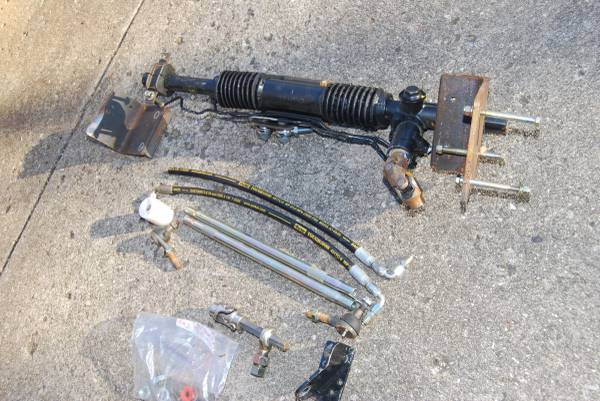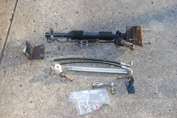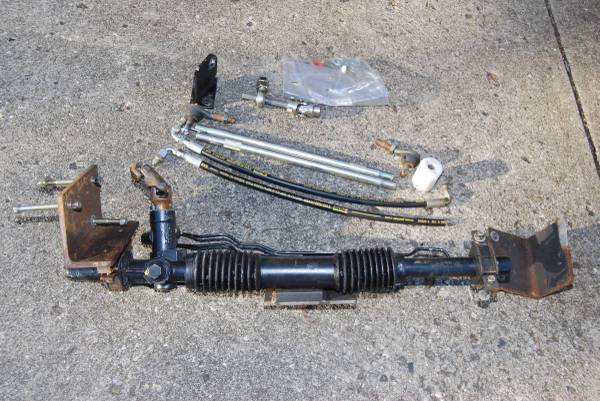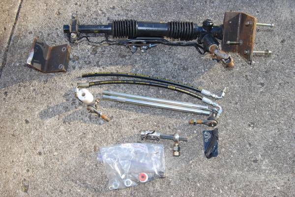 True to his claims and following the instructions, the kit bolted right in with no problems. Had I not been stymied by the header problem I would have left the unit in my car. The grinding I did on the passenger side mount for header clearance will in no way affect the integrity of the unit. You may need to drill and tap a new hole in your frame for the intermediate steering shaft support due to my modifications to the one that came with the kit. Had I stuck with the unit I probably would have welded mount to my frame for my own peace of mind. The kit came with tie rod ends that I unfortunately banged up when uninstalling the system from my car but they will also go with the kit. Since this is a power rack, unused hoses are included and the unit can be used with your factory steering pump. As you may have gathered from this lengthy description, I'll be glad to provide any additional assistance you might need to install this in your vehicle. Yours for $1100.