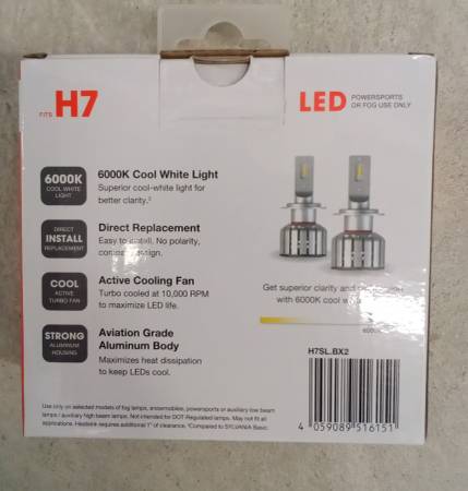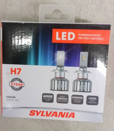 New in sealed box Sylvania LED head light bulbs. They may fit the fog lights in some vehicles. Check your owner's manual Size H7