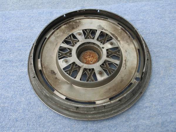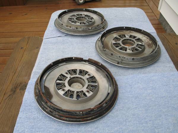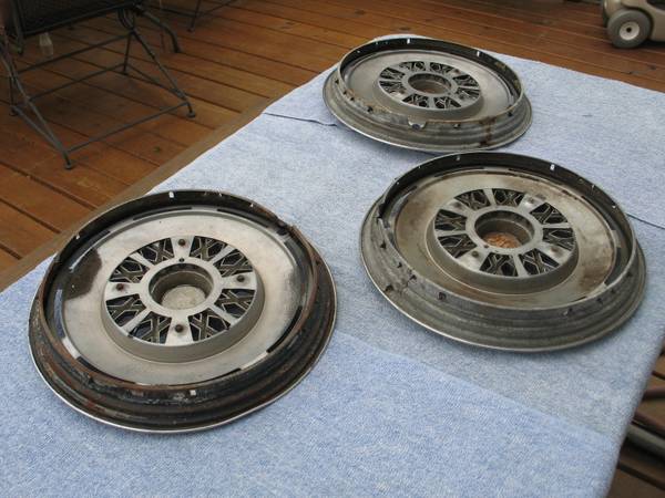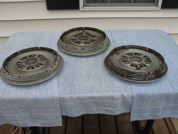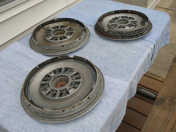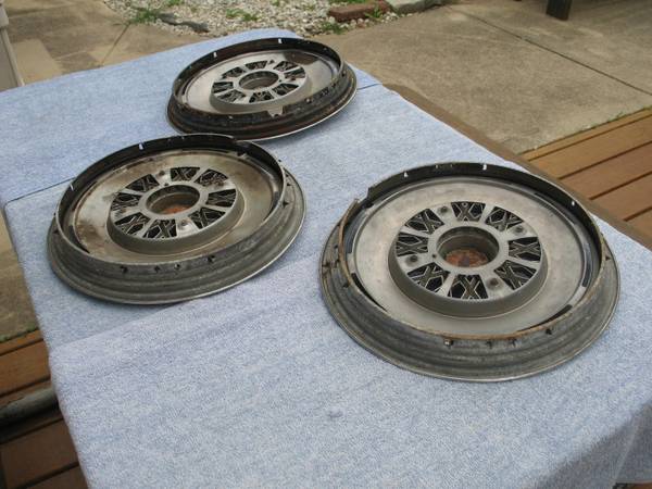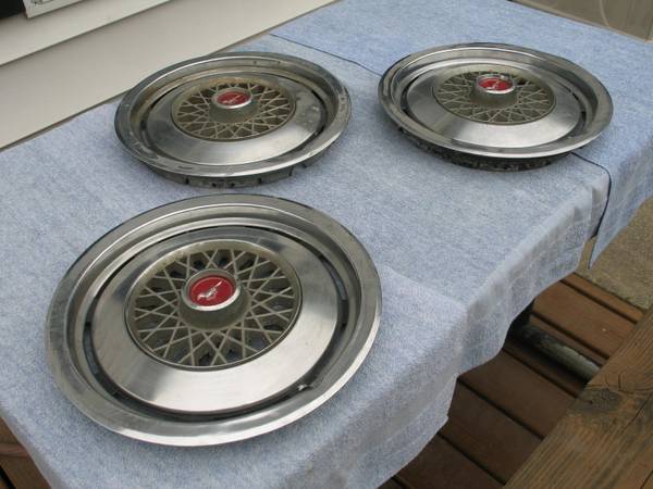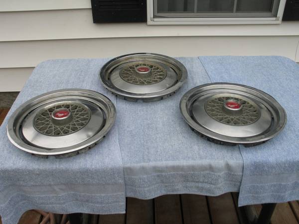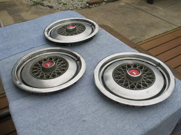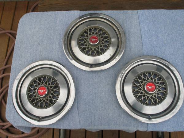 Three (3) original Ford 1974 -1978 Mustang II wheel covers in good condition. These factory hubcaps have some scratches and dings on the outer chrome edges, with some pitting on the honeycomb and red glass center cap. Back side of wheelcovers (by center) shows, "8818(3?) 4ZA-1A041-AB (Ford)" and "253651". Correct for 1974 1975 1976 1977 and 1978 Mustang. This style hubcap was also used on the Grenada and Maverick. May fit other Ford models. GC! $40 for all three caps. Will ship!