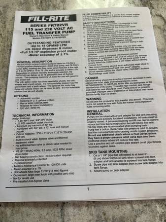 brand new in the box, fuel transfer pump, used for all fuels, diesel, gas. Included with hose and nozzle. Can deliver up to 5 to 20 gallons per minute, 115 Volts,US gallon meter has 3 resettable wheels. For 1/3 hp explosion, proof motor, meter accuracy of minus plus one percent. Sells for over $2000.