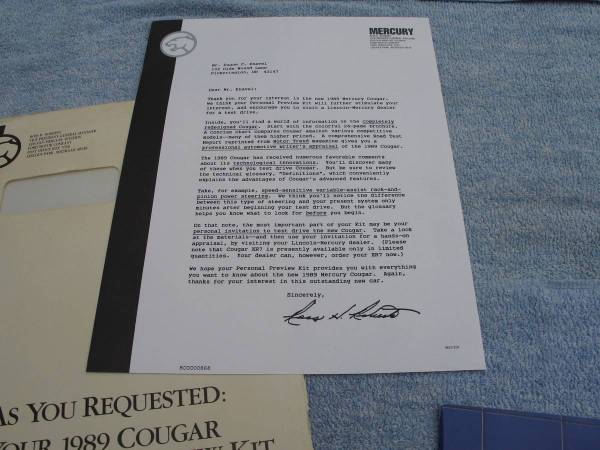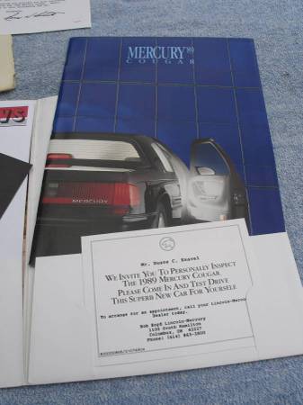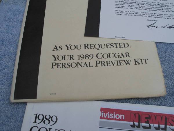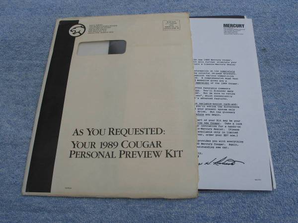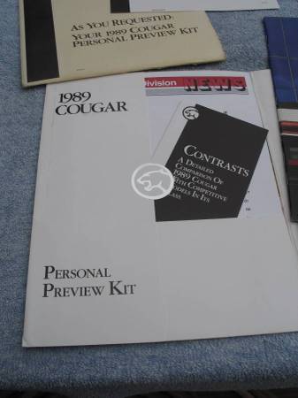 Factory original 1989 Mercury Cougar Personal Preview Kit. 24 page brochure, Motor Trend excerpt, press release sheet, portfolio with spec's and option guide at rear of brochure, along with three (3) additional folders. Includes details on the LS and XR-7 models. Measures 12" by 9", and weighs half a pound! Excellent condition! $15. Will ship!