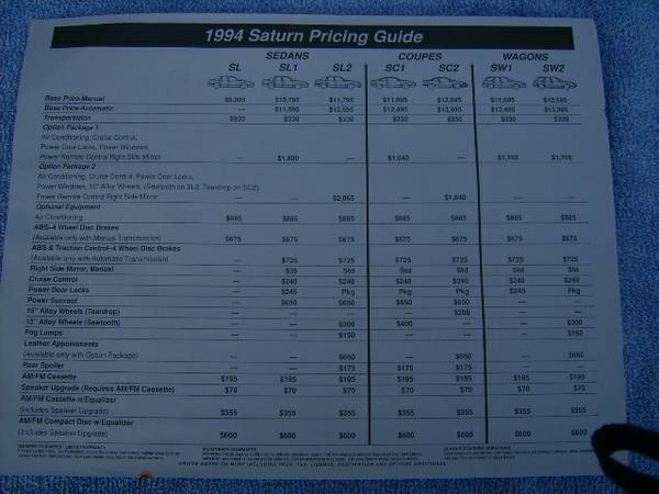 Original 1994 Saturn Dealer sales brochure, with Pricing Guide. Includes the SL1, SL2, SC1, SC2, SW1 and SW2. Very good condition, but staples have oxidized. 7-3/4" by 10-3/4". 16 pages. 8/93. $10....