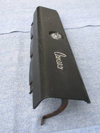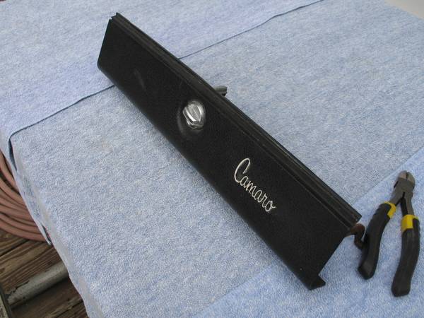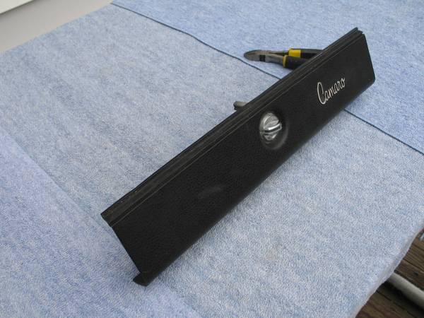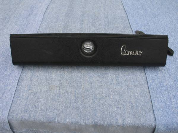 Original 1970 through 1977 Chevrolet Camaro glove box door w/script logo in black. GM part #3999446. Correct for 1970 1971 1972 1973 1974 1975 1976 and 1977 Camaro and Z/28. This factory glove box door features the "Camaro" emblem in script lettering molded into the door. Includes the stopper arm and lock assembly (no key). Plastic hinge has started to crack on both ends (a little over 2" on the left side and 1" on the right side - see photos). Good overall condition! $55. Will ship!
