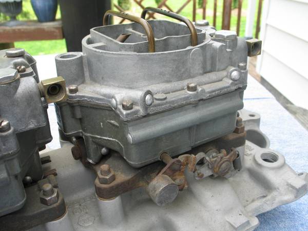 Original 1957 through 1961 Corvette dual quad setup in used condition. Aluminum 2x4 intake manifold shows GM casting #3739653. Correct dual quad carburetors for 1957 1958 1959 1960 and 1961 Corvette show 1299 lids and 0-049 bowls with correct dual quad bases. Front carburetor is stamped 1161 on the top. Winters intake manifold is dated 9 26 60 (September 26, 1960), and is very clean with original oil shield and no cracks, repairs, or welds that I can see. All linkage moves freely. Very nice original setup! $2,000. Will ship!