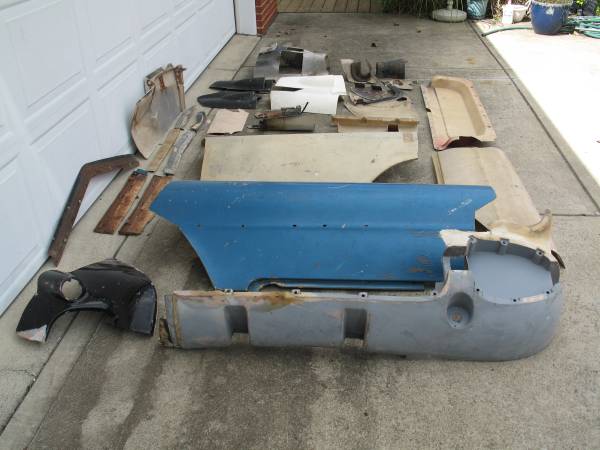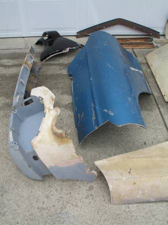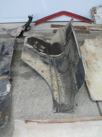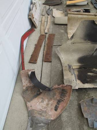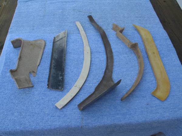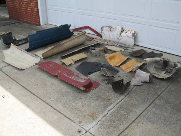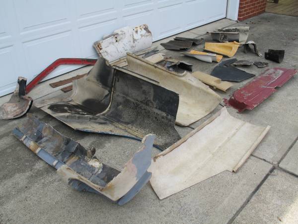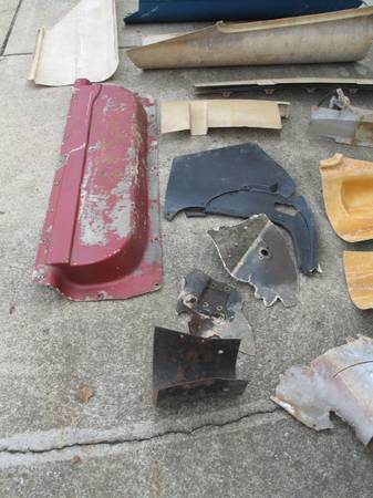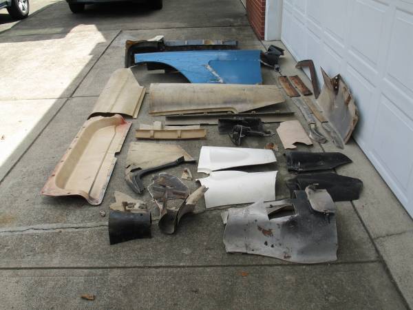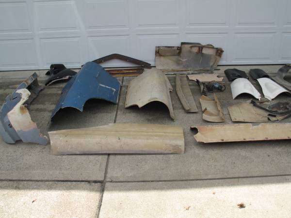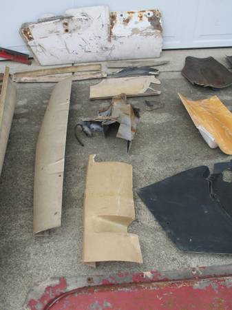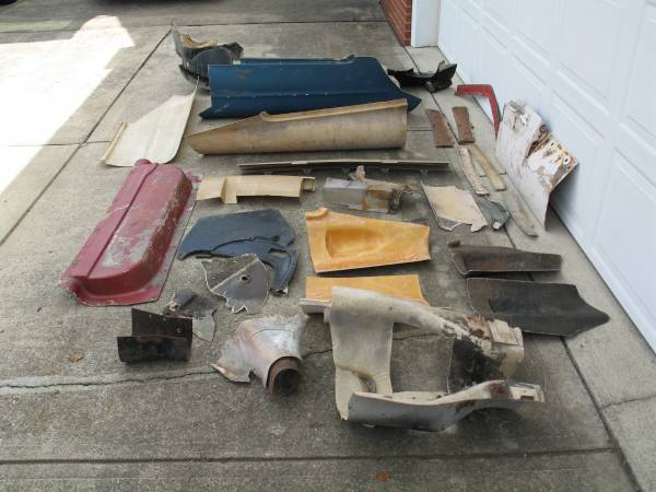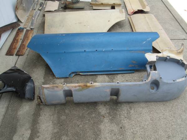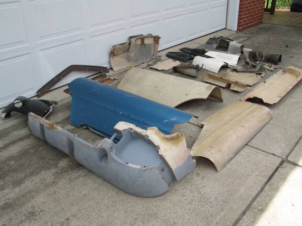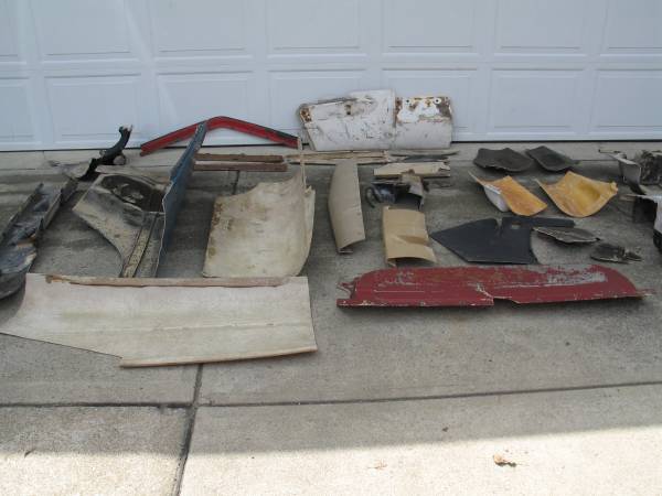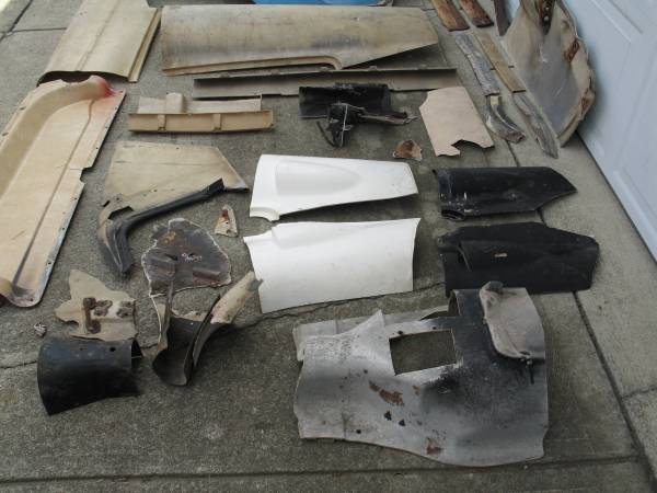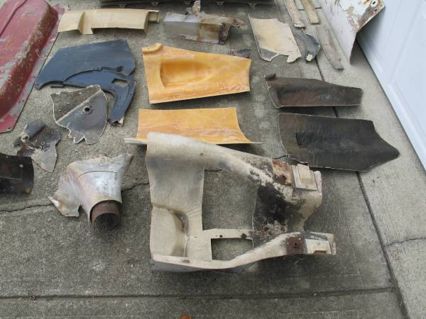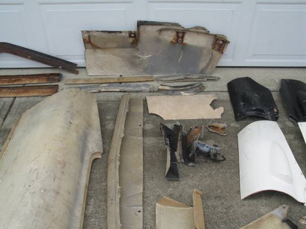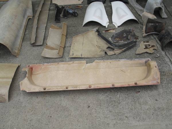 Original 1956 through 1962 Corvette miscellaneous fiberglass body panels in used and NOS condition. Collected over many decades, these panels are 90% OEM panels with many being NOS in the original white or yellow fiberglass. These panels cover 1956 1957 1958 1959 1960 1961 and 1962 C1 Corvettes. Parts include LH front side fender and upper fender, partial 58-62 front grille surround, partial lower rear valence, package tray, RH front fender, center console tunnel in white fiberglass, center tunnel support plates, along with miscellaneous parts, pieces and boding strips. Only four (4) of these smaller panels are reproductions. If you tinker on C1 Corvettes, these panels are invaluable as it's some what rare to find original GM fiberglass. $750 for everything pictured.