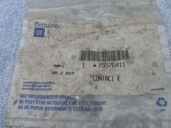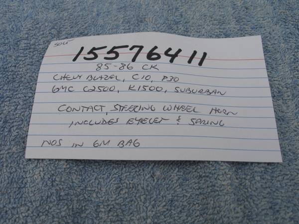 New Old Stock 1985 through 1991 GM steering wheel horn contact in new condition. GM part # 15576411. Correct for 1985 1986 1987 1988 1989 1990 and 1991 GMC and Chevrolet Blazer, C10, P30, Suburban, C2500, K1500, and others. Includes the eyelet and spring. Discontinued part from GM. NOS in the GM wrapper. $25. Will ship!