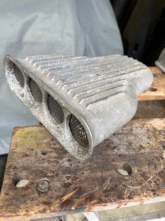 Cal Custom Vintage Aluminum Finned Air Scoop Hot Rod Original, Old School traditional scoop in good shape, Could used clean up and polish. You will need to make or buy mounting bracket , Sold as is. Note***Many of these have holes drilled in the top but this one does not. One of the 3 bottom mounting holes has opened up a bit and its easy to drill and additional if necessary. needs an additional screw up front ..has screen. Carb opening hold ID is about 5 1/8" ,Thanks for LQQking! #2