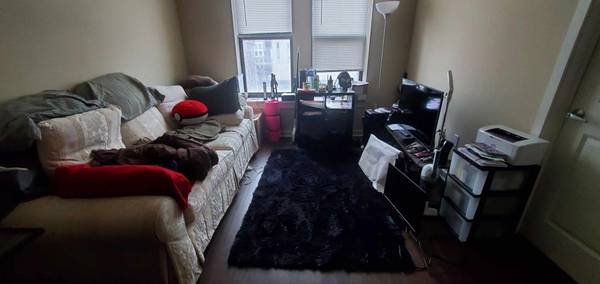 Apartment includes a fully equipped kitchen with an electric kettle, basic Keurig, and basic Ninja air fryer in addition to the apartment-provided refrigerator, electric range, microwave, and dishwasher; in-unit washer and dryer; & a currently fully furnished living room. (This may change if the current roommate takes the coffee table with her, but that will be the only piece of furniture we would need if so.)