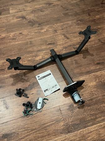 Name/description from when I bought it: "Dual Monitor Stand - Heavy Duty Dual Arm Monitor Desk Mount Fully Adjustable, Fit 2/Two LCD Screens up to 27 Inch with C-Clamp and Grommet Base, Gray"