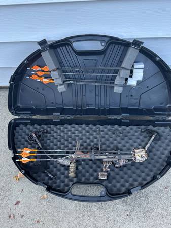 Mathews ignition solocam compound bow with 9 arrows 5 with broad heads and carrying case. 50 lb draw and 24” draw length $100