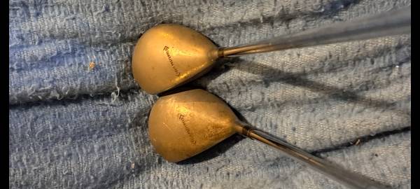 Nice pair of Taylor Made metal drivers. The pair includes a 9.5⁰ Burner Plus and a 12⁰ Tour Brassie. The Burner plus has a frayed grip end closest to the head. You don't grip there. I would tape it, but chances are it wouldn't be how you would want it taped. The other clip just has a few small pieces missing the same spot as the other club. You need to get inches from it to see them