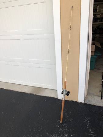 This is an old ocean pole and reel. Still useable but probably would make an excellent piece for wall or corner of a nautical themed room, cabin, home or condo.