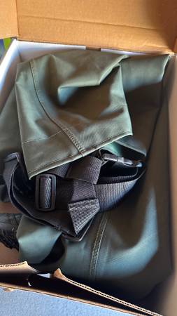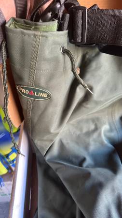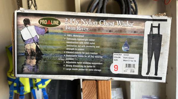 In New condition chest high waders for fishermen, dock repairs. Soles like new in original box $74.99 new. Box says mens 7-14 size 9, 2 ply nylon100% water proof, adjustable suspenders.