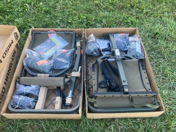 Bought new last year, and never got to use them last year or this year. I dont have that much time to hunt deer as I hoped I would. Both of these are new and never been used or have been outside. Have been sitting in my basement since I bought them. They come with everything a new one would come with. Mounting straps, safe line and carabiner, full body harness and carrying straps. Can use cash for the holiday season. Asking for $530 for both. My loss your gain.
