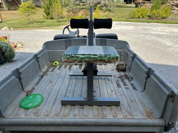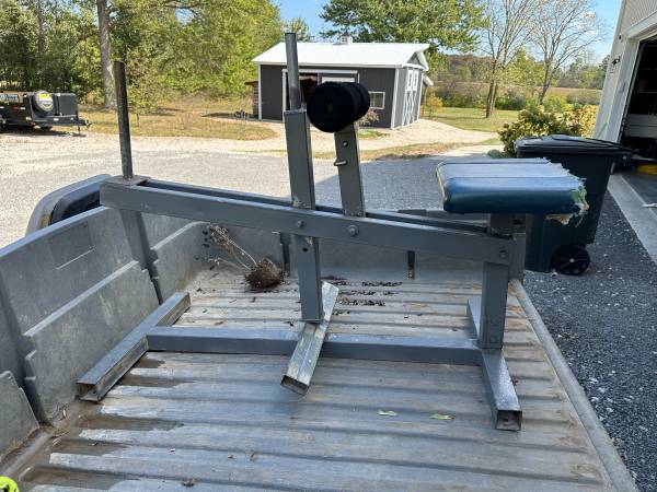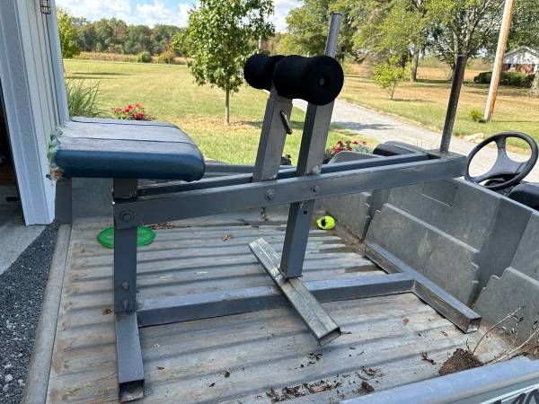Seated calf raise machine for sale. Everything works fine and the machine can be loaded with a substantial amount of weight without losing stability or feeling unsafe. It is a little rough, missing paint in a few places, dogs have chewed on the seat cushion, and there is some surface rust at the base.