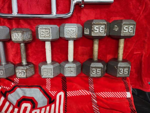 A SET OF DUMBELLS AND KETTLE BELLS TOTAL WEIGHT 349 POUNDS. IT ALSO COMES WITH A NEW CURL BAR AND A NEW HAMMER CURL BAR. ALL IN GOOD CONDITION. NO TEXT. NO E-MAIL. PHONE CALLS ONLY. CASH ONLY. PICK...