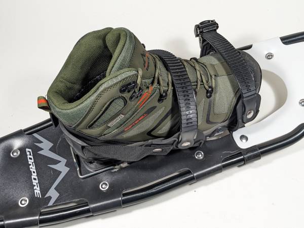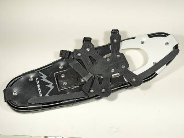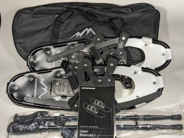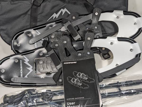 NEW SNOWSHOES by GORPORE (china) Step-In style w Regular shoes or boots Comes with a decent pair of Trekking Poles Brand New in unopened box Black Plastic & fake leather, metal spikes, aluminum...