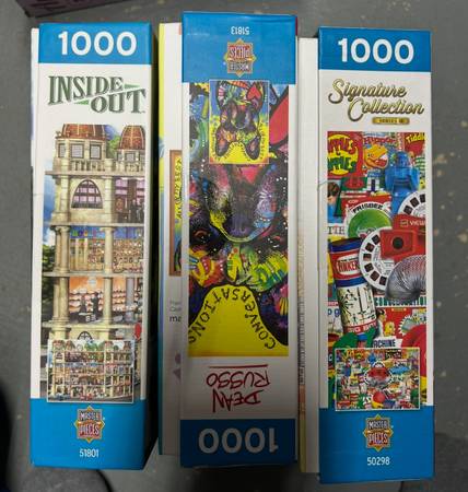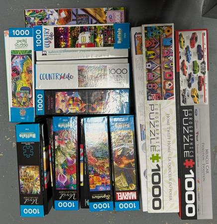 25 lovingly cared for puzzles. Majority are 1000 piece Eurographic brand puzzles or Buffalo brand puzzles. They are vivid in color and vary in picture. I’m willing to meet up in a public place near...