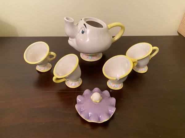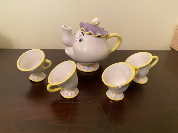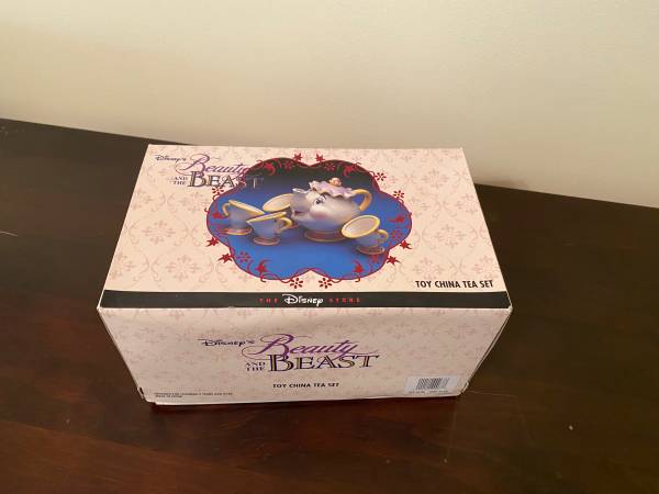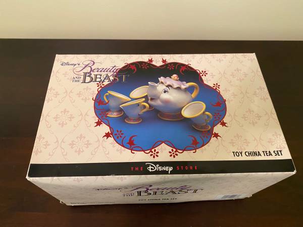 Vintage Disney - Mrs. Potts Tea Set from Beauty and the Beast. Six piece toy china tea set (in original box & packaging, never used). Mrs. Potts teapot, lid, and four tea cups. One teacup is designed with a “chip” in the rim to represent Chip, Mrs. Potts’s son. (From the website: “An adorable and charming teacup (and Mrs. Potts' son), who befriends Belle and eventually helps her and her father escape the villagers' trap.” ―Diamond Edition website)