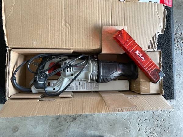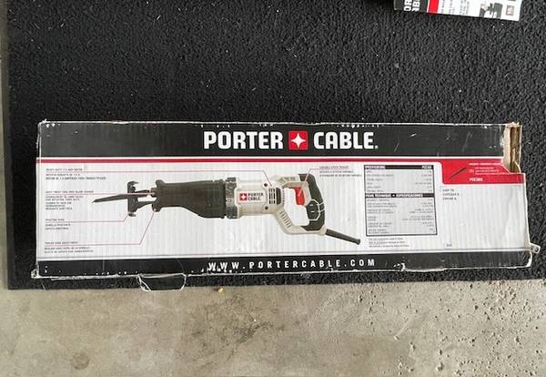 Porter Cable 7-1/2 Amp Variable Speed Reciprocating Saw- Model PCE360; lightweight; low vibration; pivoting shoe to steer around objects while cutting; depth adjustable shoe; heavy-duty 7-1/2 Amp motor cuts through metal, wood, other materials; variable speed trigger (0-3,200 SPM); blades easyu to change (twist-lock, tool-free blade) – Used rarely/like new! $80
